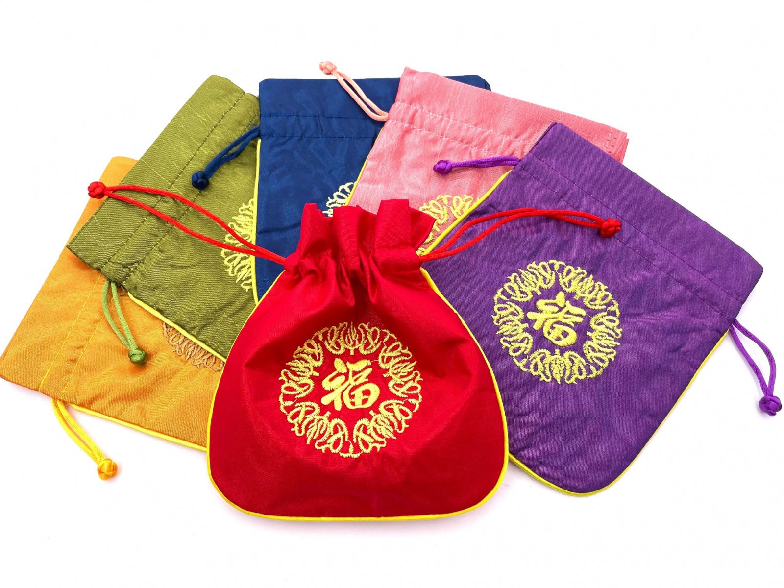 Diese schönen Beutel mit dem Glückszeichen „Fu“ eignen sich ideal zur Aufbewahrung von Kleinigkeiten wie Edelsteinen oder Schmuck.\nDie Beutel sind aus Brokat und es gibt 12 Stück in 1 Beutel. Es gibt verschiedene Farben in einer Tasche.\n\nMindestbestellmenge: 1 Paket\n1 Beutel = 12 Stück\nPreis ohne MwSt