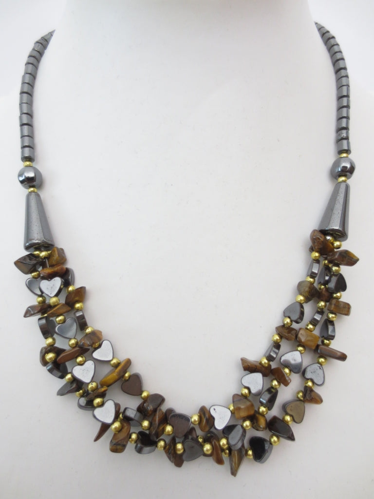 Praktische Hämatit-Kette mit Tigeroogt-Edelsteinen und Hämatit-Hartsteinen. Diese Kette besteht aus 3 Schichten. Die Kette ist 45 cm lang.\nMindestlänge beträgt 2 Stück\n