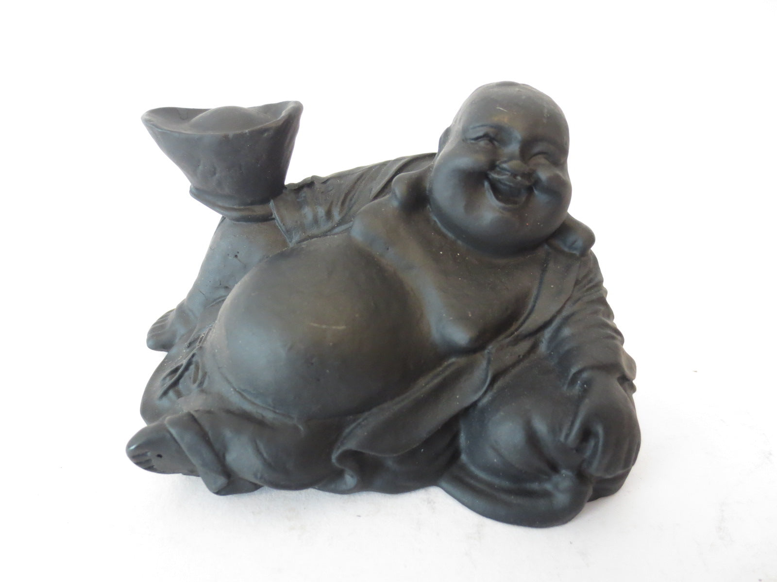 Kleiner liegender schwarzer Buddha\nMaterial: PolyresinGewicht: 175 GrammAbmessungen: Länge: 5 cm x Höhe: 8,5 cm\nMindestbestellmenge: 2 Stück.